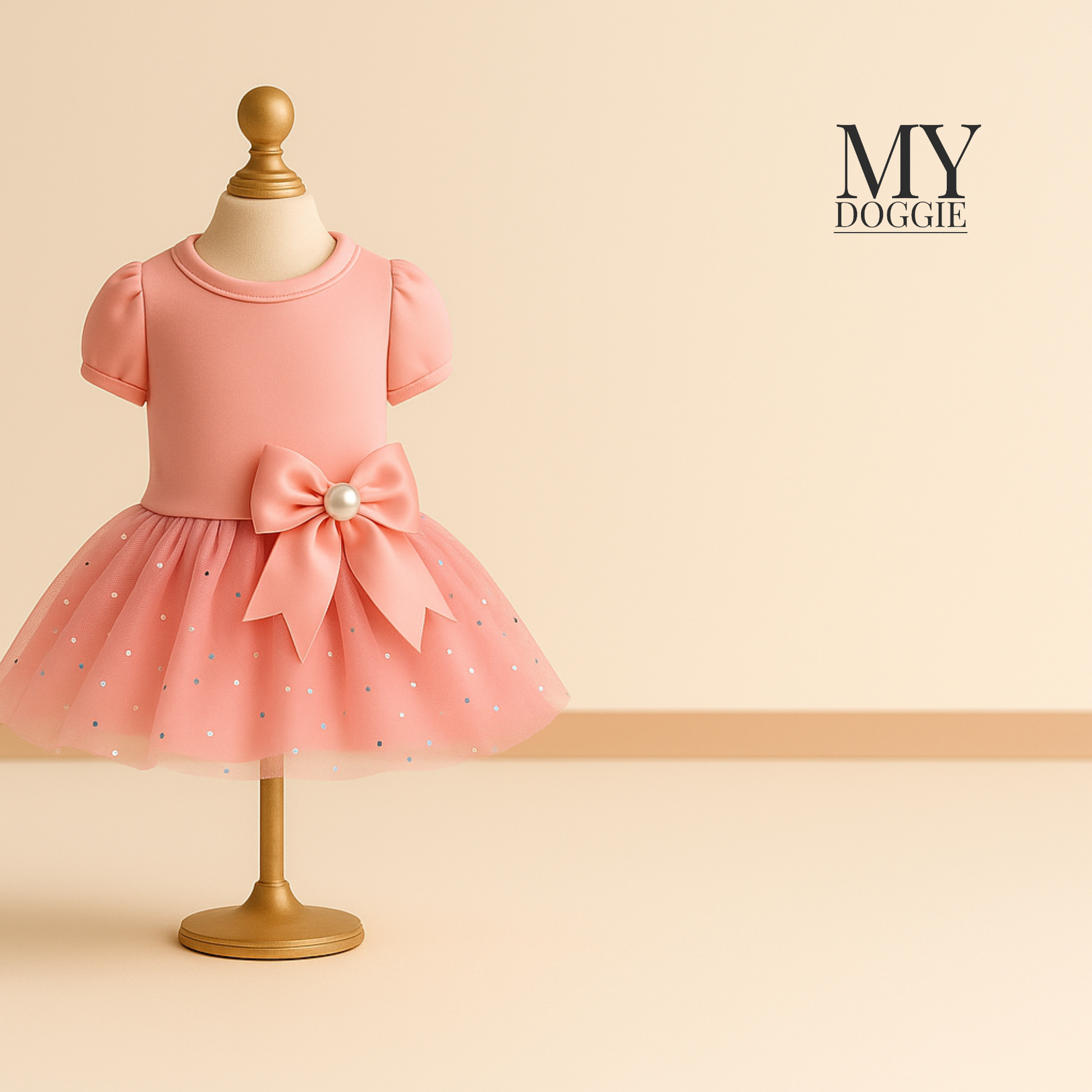 My Doggie Luxury Velvet Dog Dress — Pink Princess Outfit with Glitter Tulle Skirt & Satin Bow with Pearl Detail — Premium Gift-Ready Pet Dress