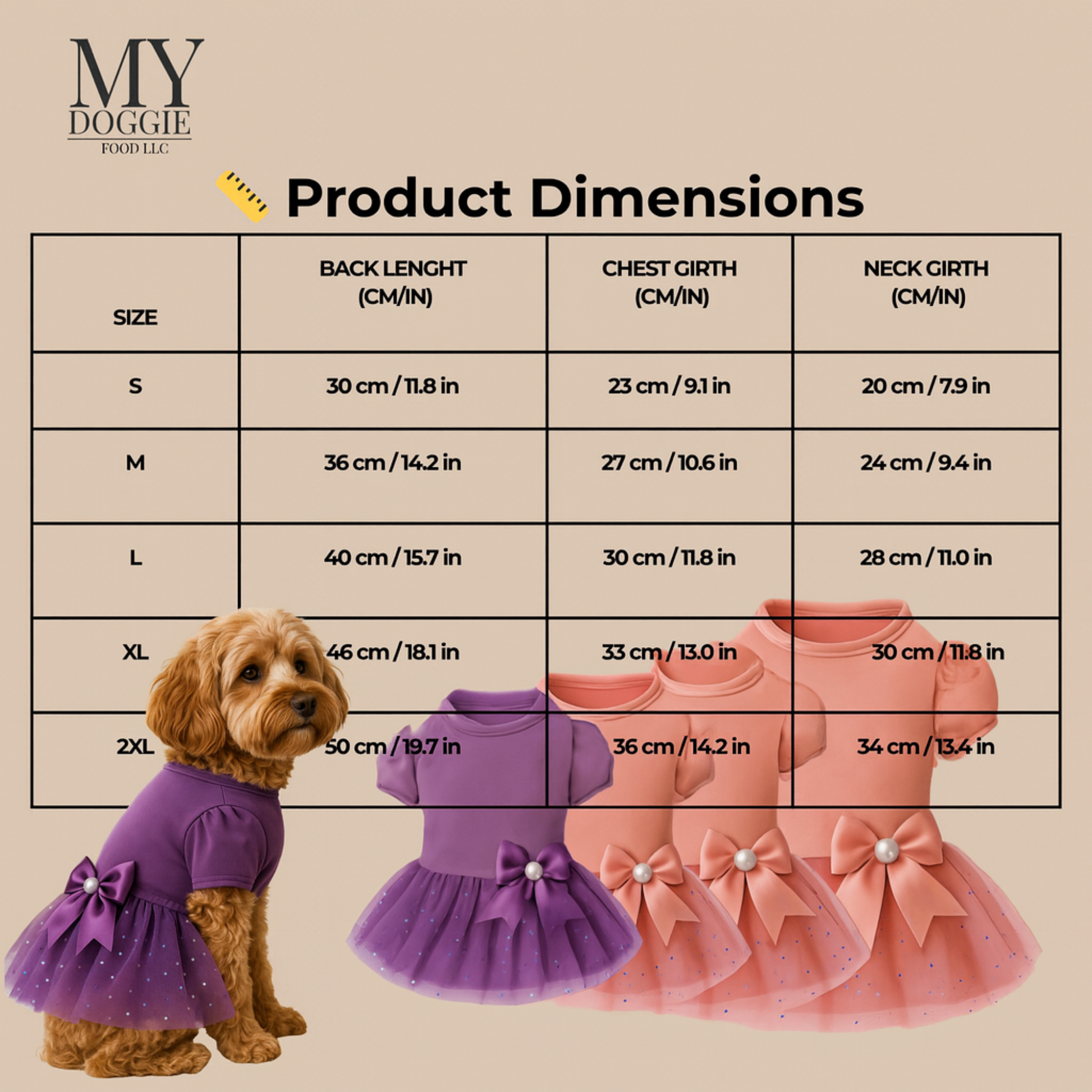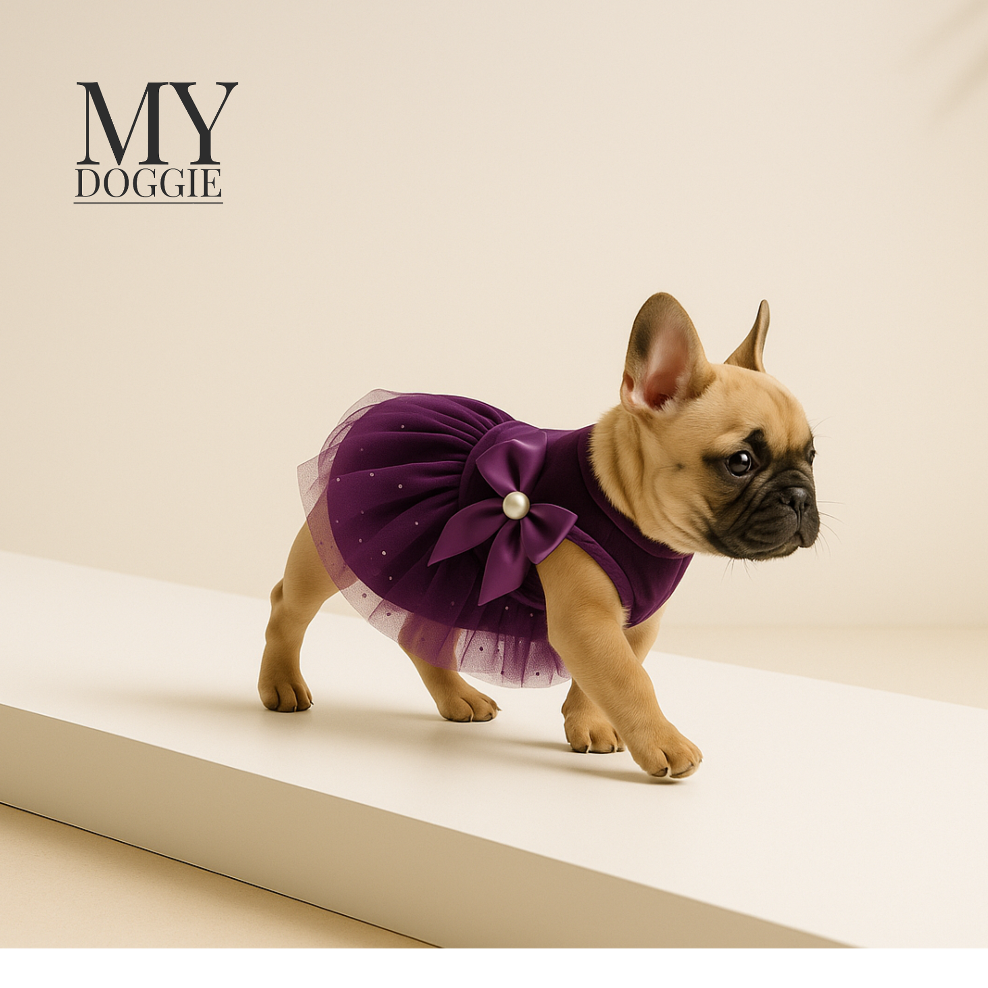 Treat your dog like royalty with the My Doggie Luxury Velvet Dress. Handcrafted from soft, premium velvet with a breathable lining, this couture-inspired outfit features a layered glitter tulle skirt and an elegant satin bow accented with a pearl. Lightweight and designed for comfort, it’s perfect for parties, birthdays, weddings and photo shoots. Each piece ships in premium gift packaging — a beautiful present for any special occasion. Available in multiple sizes. Check our size chart to ensure the perfect fit.